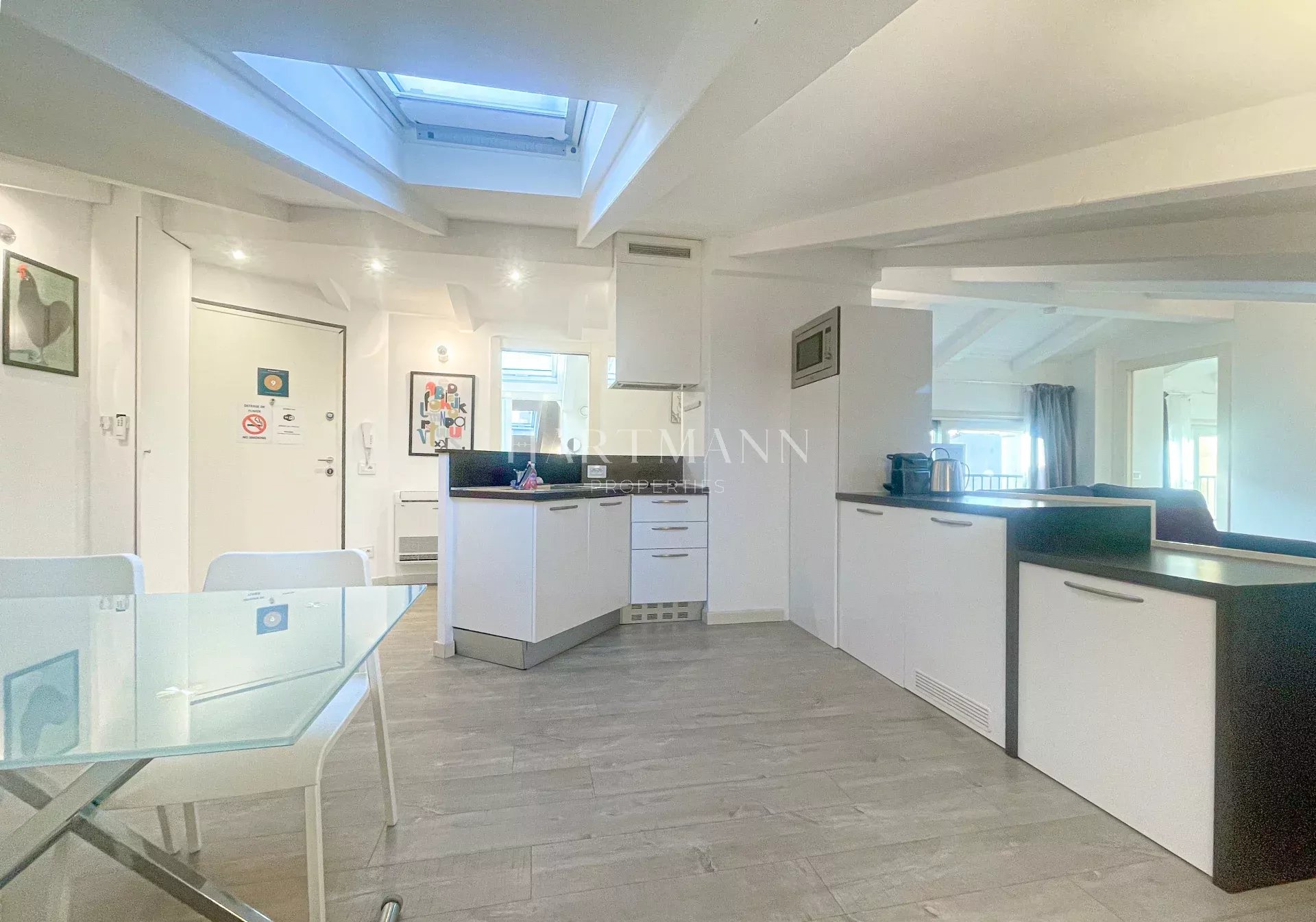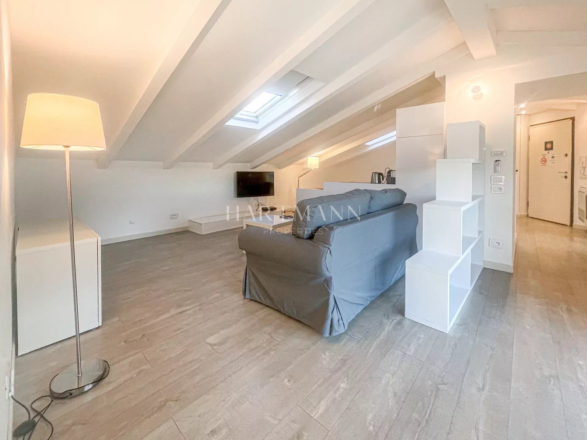 L’appartement comprend un vaste séjour avec cuisine américaine équipée, une chambre confortable ainsi qu’une salle de bains avec WC.