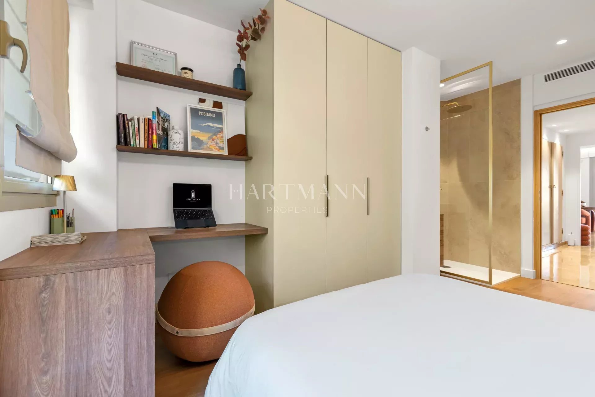 L’espace nuit comprend deux chambres, dont une suite avec sa propre salle d’eau, ainsi qu’un espace bureau idéal pour le télétravail.