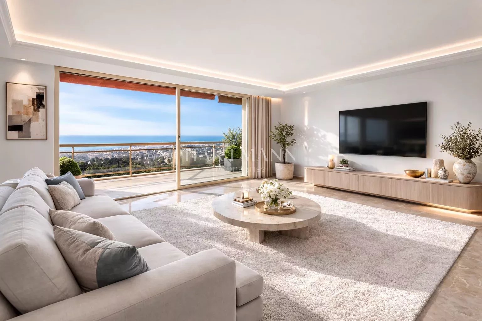 un séjour lumineux ouvert sur une terrasse avec vue mer panoramique,